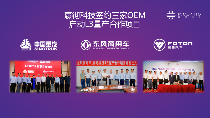 继在今年6月的CES Asia上发布L3样车嬴彻1号和2021年底实现量产这一目标,嬴彻在这次交流会上正式回应已和重汽、东风、福田三家主机厂签约量产合作,并详细披露了在过去短短三个月里L3量产项目取得的各项进展: