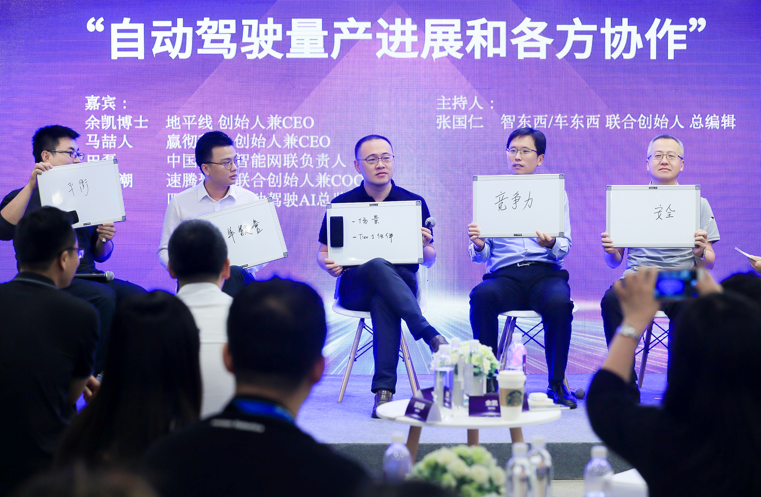 (从左至右:四维图新自动驾驶AI总监李阳、速腾聚创联合创始人兼COO 邱纯潮、地平线创始人兼CEO 余凯博士、中国重汽智能网联负责人 田磊、嬴彻科技创始人兼CEO 马喆人)